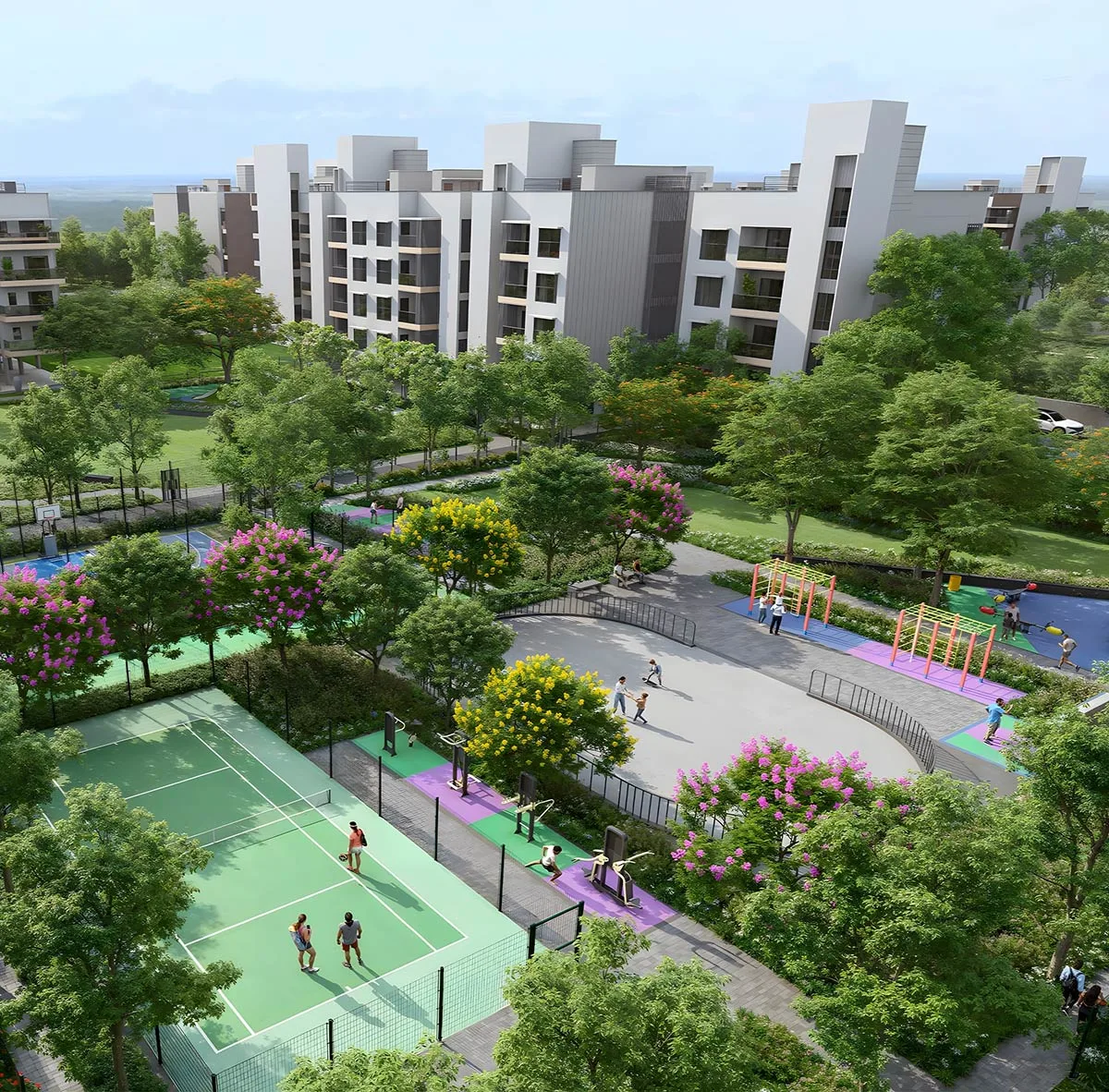 Residents enjoy landscaped greens, clubhouse facilities, fitness areas, children’s play zones, and advanced security.