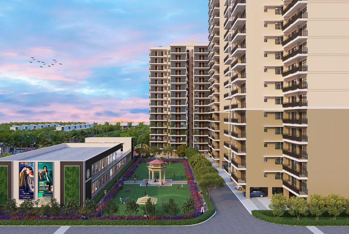 Residents enjoy landscaped gardens, jogging and cycling tracks, children’s play areas, community halls, and 24×7 security.